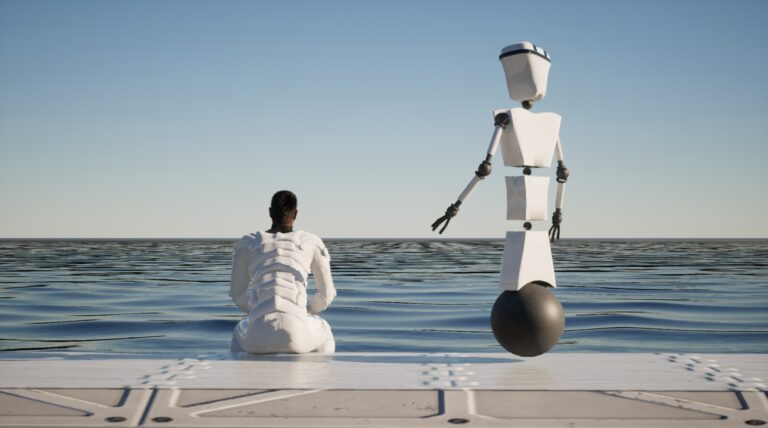 Impuissants, perdus au milieu d’un océan à perte de vue, Chef et le robot patientent. Dans l’expectative d’un événement quelconque leur permettant de s’extraire de cette impasse, ils attendent. Mais rien, aucune perturbation. Le clapotis de l’eau sur le vaisseau constitue le seul élément dynamique de cette scène statique. Le regard fixé sur l’horizon, Chef se tourne pour faire face au Robot et décide de rompre le silence.