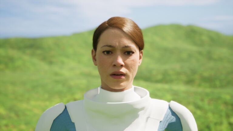 Du haut d’une colline, sur un chemin sinueux et parsemé de hautes tiges herbeuses, la femme pilote, elle même visiblement découragée par sa propre situation, s’assoit un instant sur le sol. Déterminé à atteindre cette lointaine chimère sur les hauteurs verdoyantes, Chef maintient sa course effrénée à travers le désert écarlate tandis que la machine, programmée à achever sa mission, le pourchasse à présent. Tous deux se retrouvent talonnés par la tornade qui les rattrape peu à peu, en opacifiant l’éclatant bleu azur du ciel par ses fines particules de sable ocré. La distance entre l’homme et la machine ne cesse de se réduire. La femme observe la tempête s’approcher d’elle avec une certaine lassitude, puis porte inconsciemment son regard plus bas, vers la silhouette de Chef en pleine course. Elle se redresse tout à coup et réalise qu’il tente de la rejoindre avant que la simulation ne les sépare à nouveau tous les deux. Elle quitte le sentier et coupe à travers champs pour descendre à toute vitesse la colline et atteindre son unique espoir. Chef l’aperçoit à son tour et redouble d’effort.