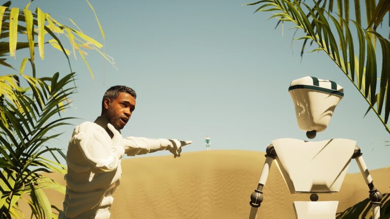 Dans sa course Chef aperçoit une forte luminosité transparaître à la lisière de la forêt à seulement quelques enjambées. Porté par son élan Chef faillit tomber dans une profonde faille située au terme même de la jungle. Il est rattrapé par le robot qui le saisit par le dos de sa combinaison et le rapatrie sur la terre ferme d’un geste rapide et maîtrisé. Se relevant aussitôt pour repérer l’origine du tir de la fusée, Chef découvre une crête dunaire se dressant à une centaine de mètre droit devant eux. Une silhouette se dessine clairement au sommet de la dune.